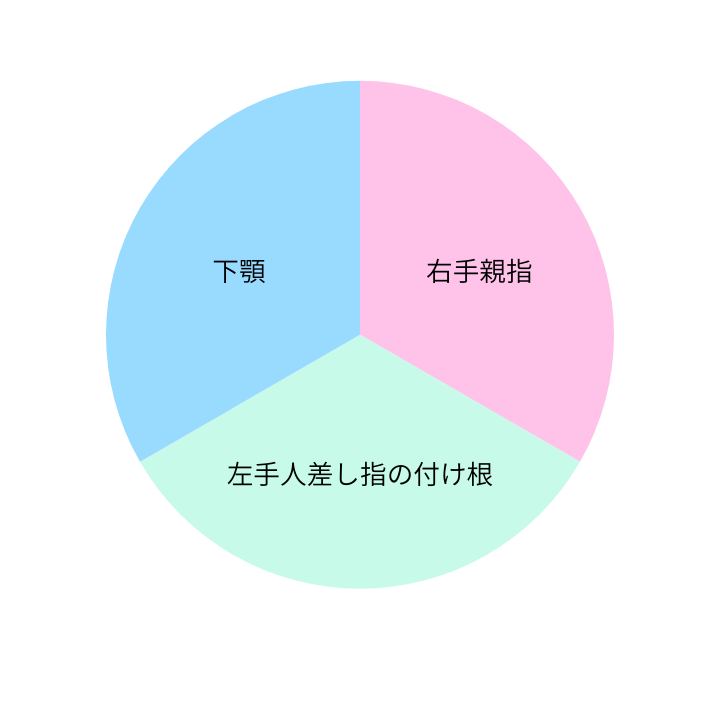 「3点支持」は、右手の親指、左手の人差し指の付け根、下顎の3点でバランスを取って支える方法です。しかし右手の親指をどう使うかで、「3点」の負担割合が大きく変わります。私も25年ほどフルートを吹いてきましたが、私自身の3点支持のパワーバランスの変遷を表してみます。