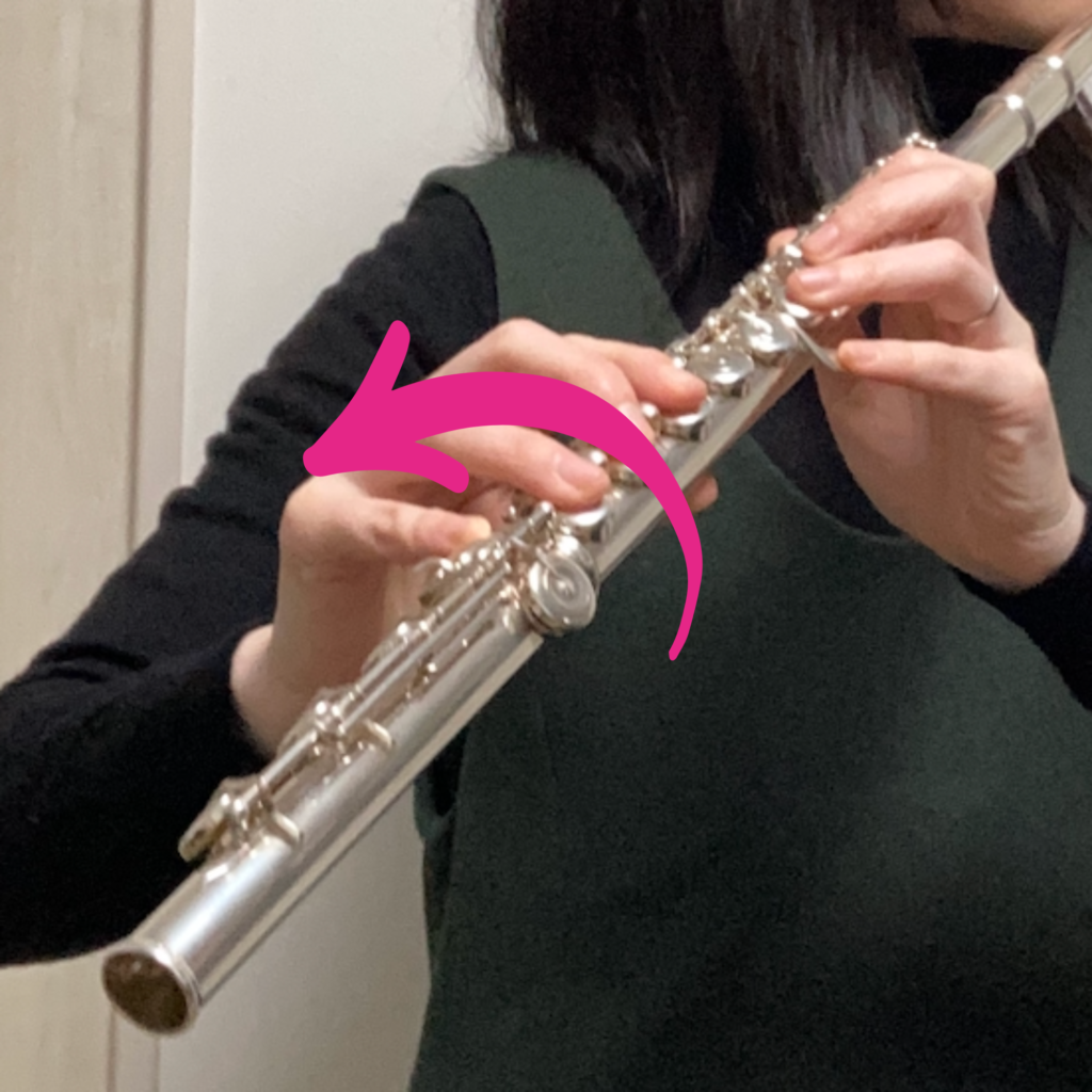 もし普段と胴部管の角度が変わった場合には、頭部管の角度も調整が必要になります。右手の親指を楽器の真下に置いていて転がることに悩まれていた方の場合、頭部管を今よりも自分の方へ回転させ、歌口を手前に傾けてあげると良いです。どれくらいかというと、今までより胴部管を向こう側に傾けたのと同じ分だけです。