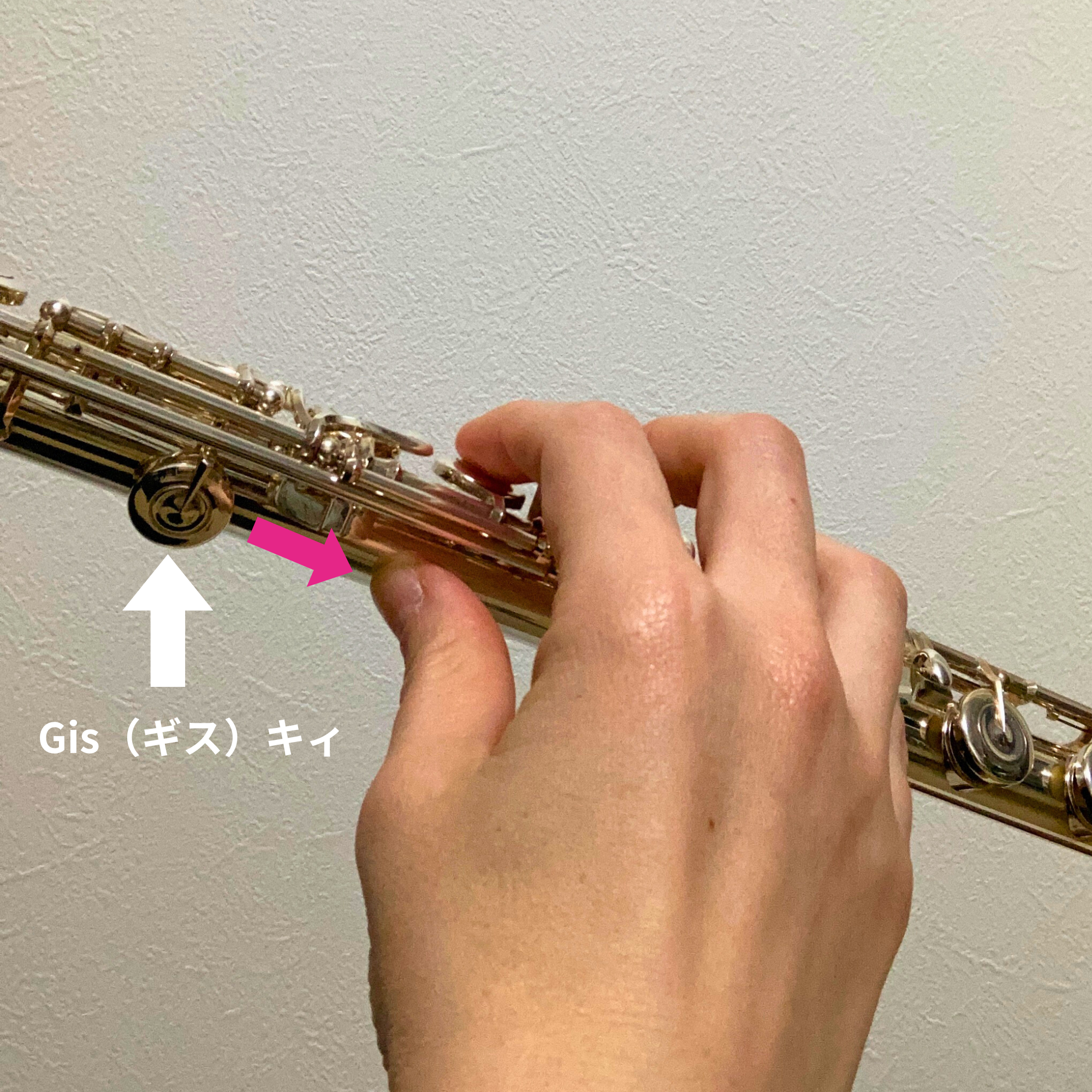 仮にキィを天井に向かって真上に保ちながら、上記の親指の位置…Gisキィの延長線上に置いてみると、楽器が落っこちそうになると思います。キィの手前にはメカニックがたくさんついていますので、転がってきて当然です。キィを真上に保とうとすることが、むしろ演奏のしにくさに繋がってしまってしまうのです。